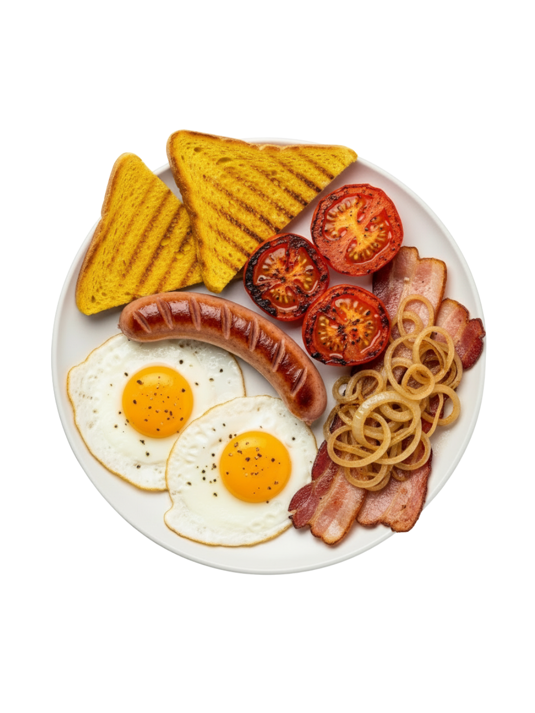 ALEMAN: 2 Huevos a la plancha, salchicha, bacon, cebolla y tomate a la plancha con